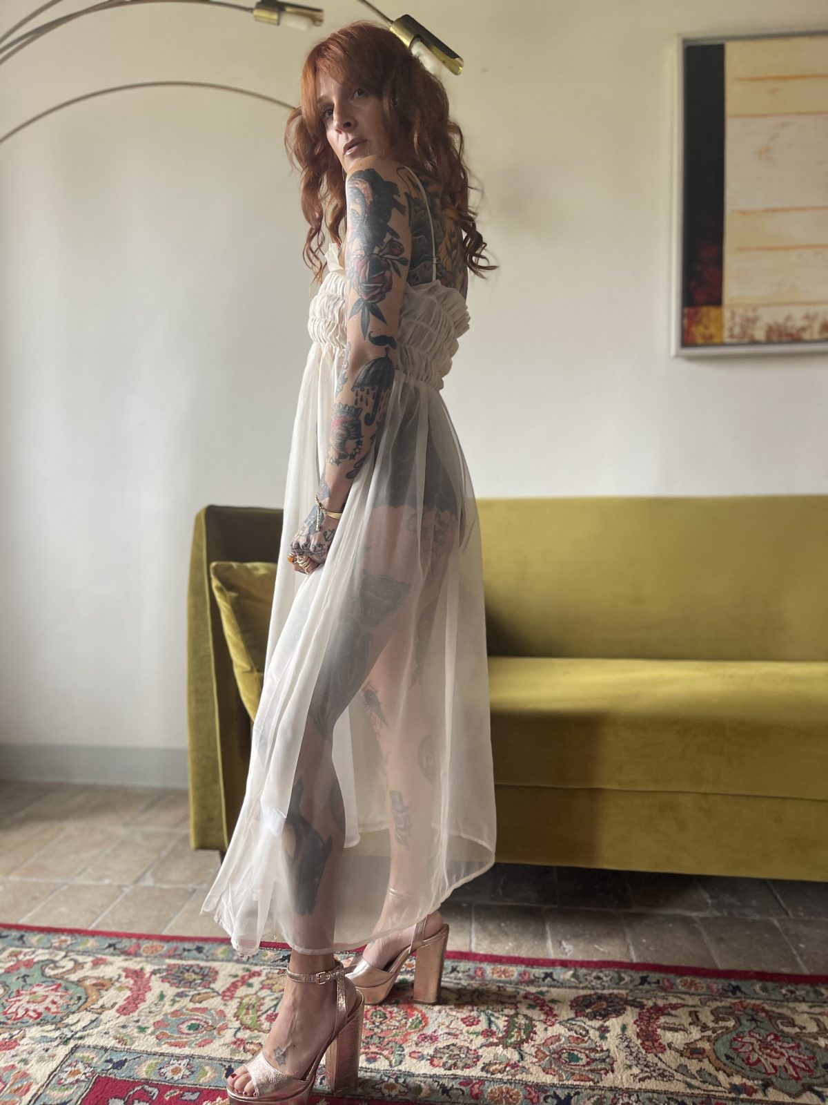 Slip dress in voile trasparente color cipria