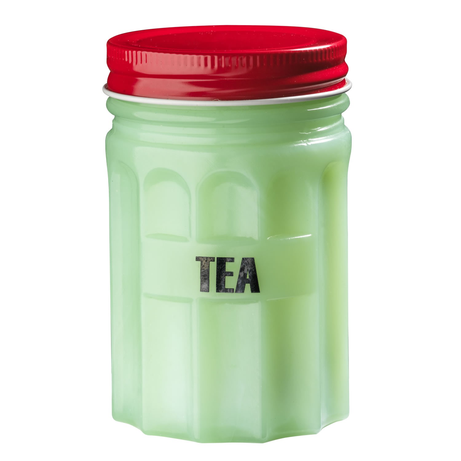 Barattolo stile vintage in vetro opalino verde con coperchio in metallo rosso.
