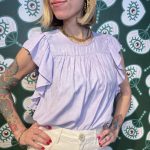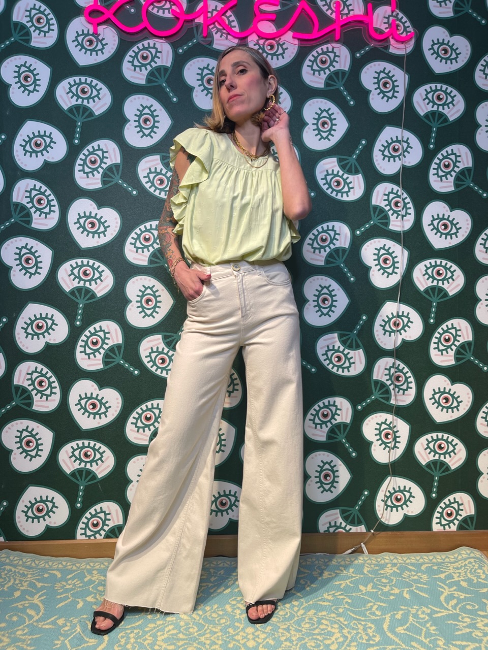 Blusa senza maniche e volant color Lime con ricamo tono su tono