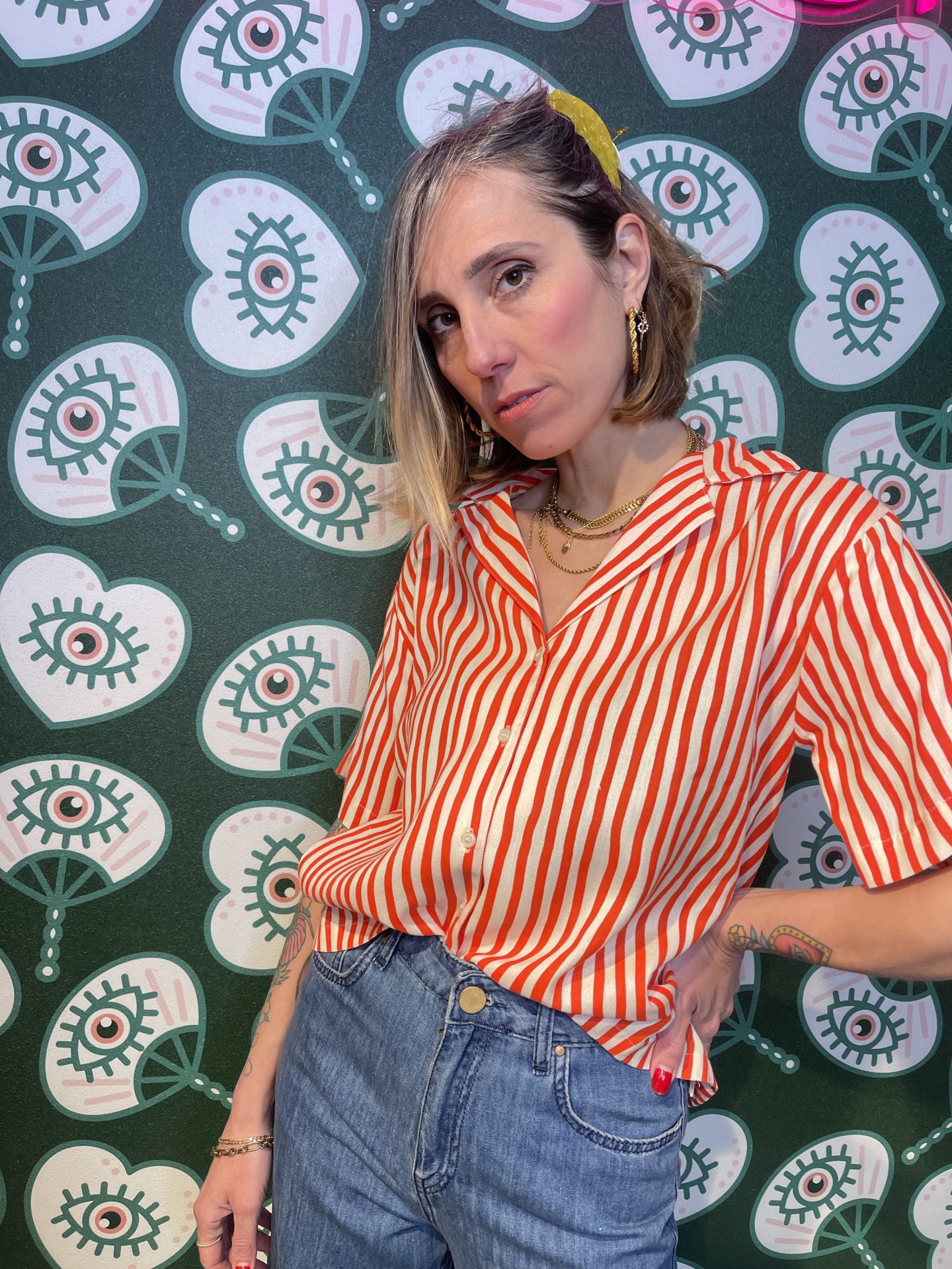 Camicia in tela di cotone stampa righe scollo a V anni ’50