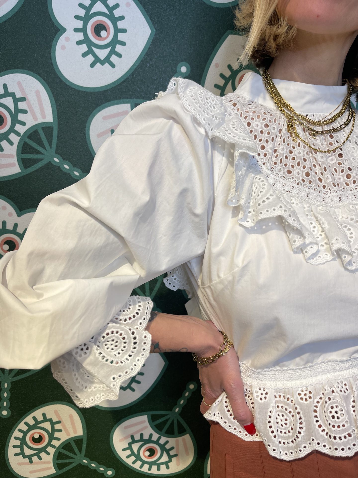 Camicia in cotone con davanti in sangallo e collo vittoriano,