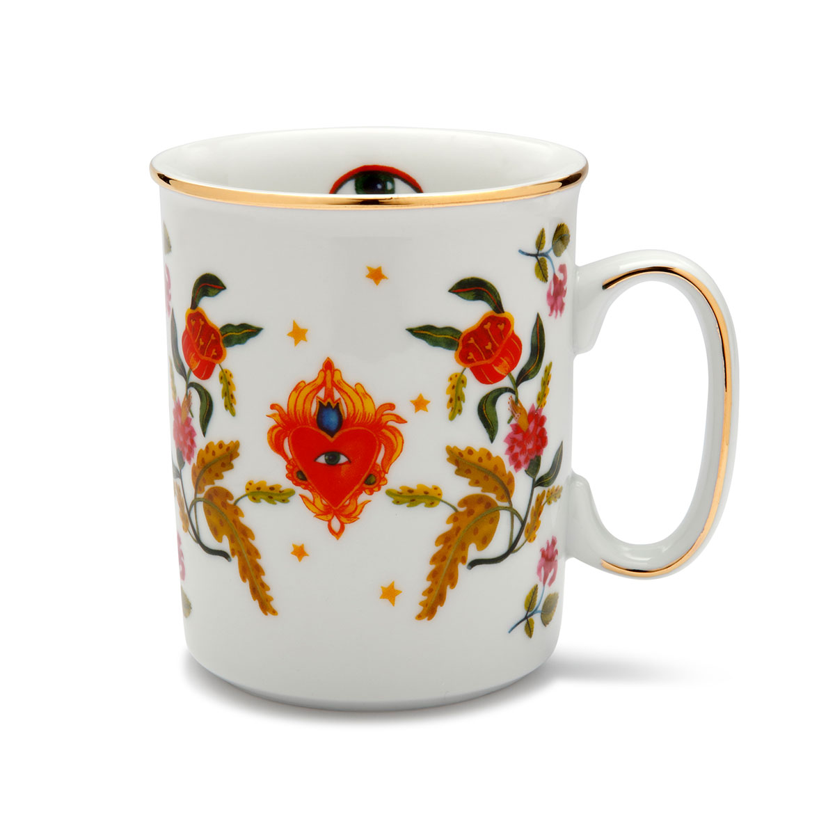 Tazza in porcellana illustrata con filo d’oro dipinto a mano.